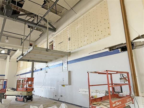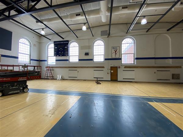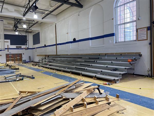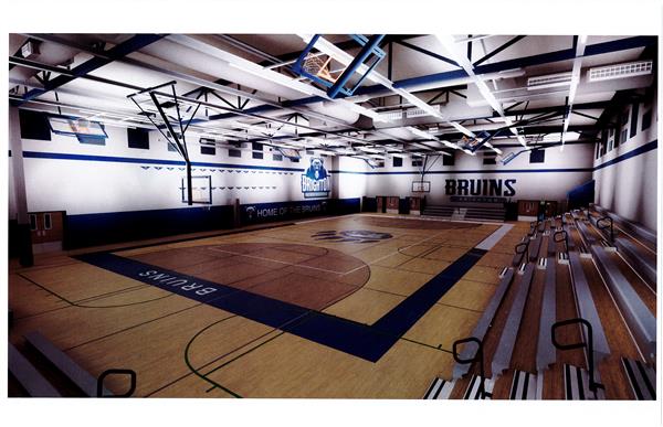 The press box has been taken down, the divider wall and bleachers have been removed, and new basketball hoop structures are going up. We have an architectural rendering of what the gym will look like in the fall of 2024.